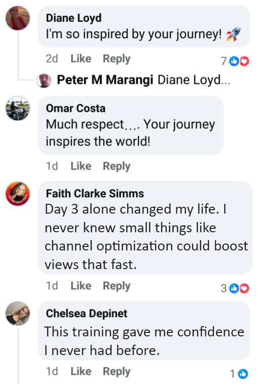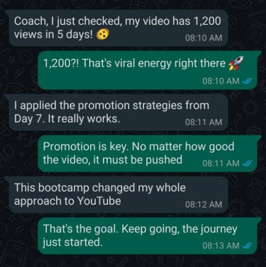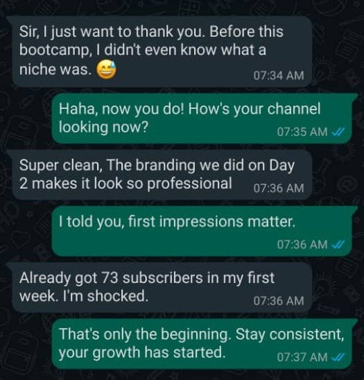 Instead of guessing and struggling alone, imagine if you had a daily, guided system that shows you exactly what to do, step by step – and in just 7 days, you could set up a money-ready channel and gain your first 100 subscribers. Would that interest you?
